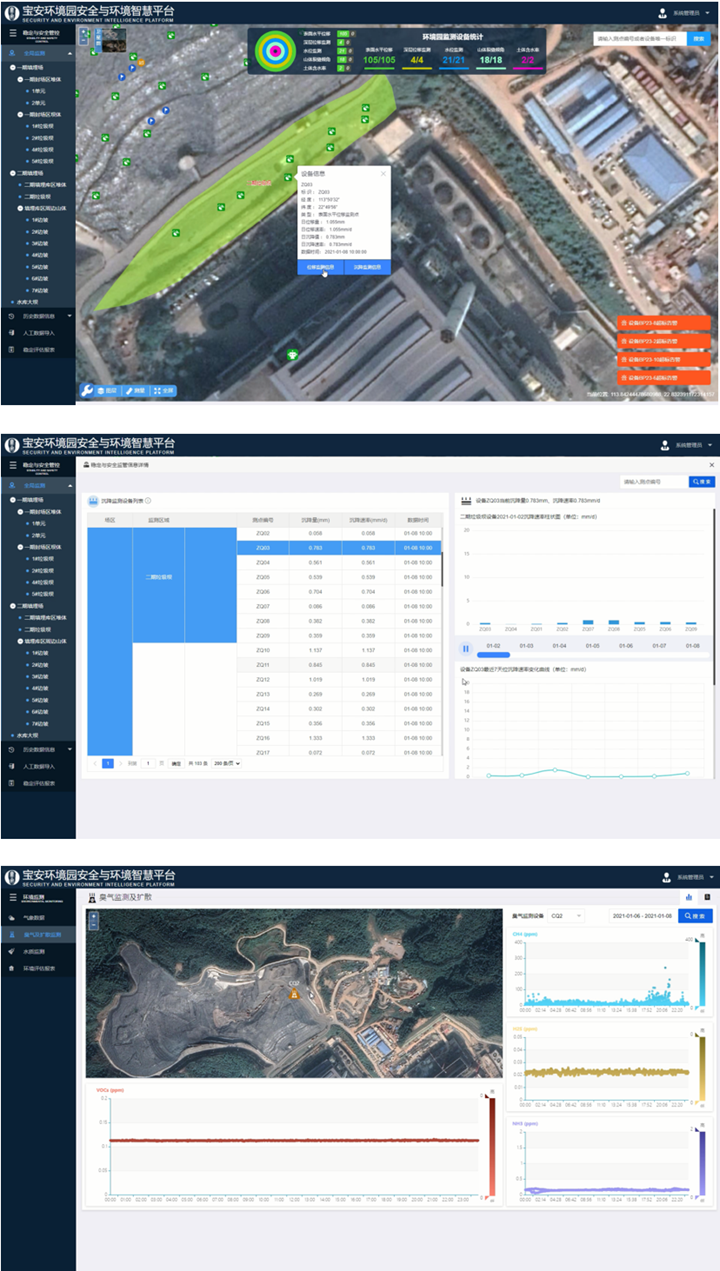 系統實現對園區穩定安全與環境安全的自動化監控;通過填埋場堆體內滯水位和主水位數據的在線監控,基于穩定分析提出安全預警等級,掌握填埋堆體的實時穩定安全性;通過填埋場堆體、堤壩和填埋場周邊山體沉降、表面位移和深層位移的在線監測,掌握園區穩定安全動態;通過園區臭氣濃度的在線監測,掌握園區實時環境安全情況,并及時預警。基于在線監測系統,提高園區運營管控能力。。