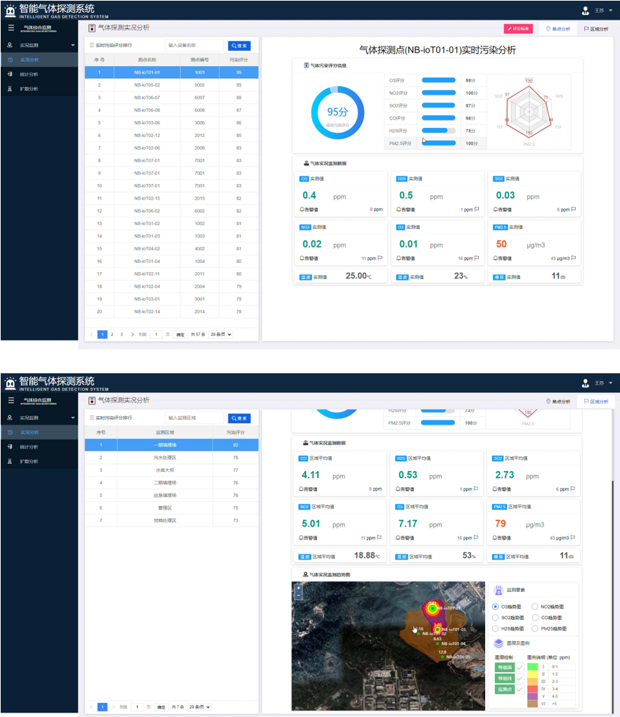 系統實時采集探測設備通過5G網絡上傳的監測數據,通過智能解析、處理和分析形成實時監測產品數據,并執行相應的告警。系統支持自定義評價規則實現對單個監測點和指定區域實時污染情況分析,及時掌握監測區域的污染來源。同時系統支持移動協同管理,大大提升系統靈活度,減輕管理工作難度。
