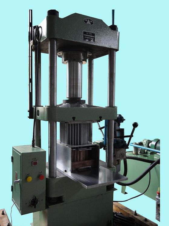 工作原理:壓制工作前,壓機(jī)模具處于開放起始位置。將一組紙筒裝入盒子內(nèi),用補(bǔ)償釘板結(jié)合引沖板將紙筒固定于補(bǔ)償釘板上,抽離引沖板,用裝藥器定量將泥土兩次裝填送入釘板下紙筒內(nèi),將紙筒盒送入壓機(jī)模具內(nèi),定位后啟動壓機(jī),在主缸作用下,上模快速下移,觸到泥土?xí)r變?yōu)槁傧乱疲敝吝_(dá)到設(shè)定壓力,保壓延時退回,取出壓好的紙筒,完成一個工作循環(huán)。