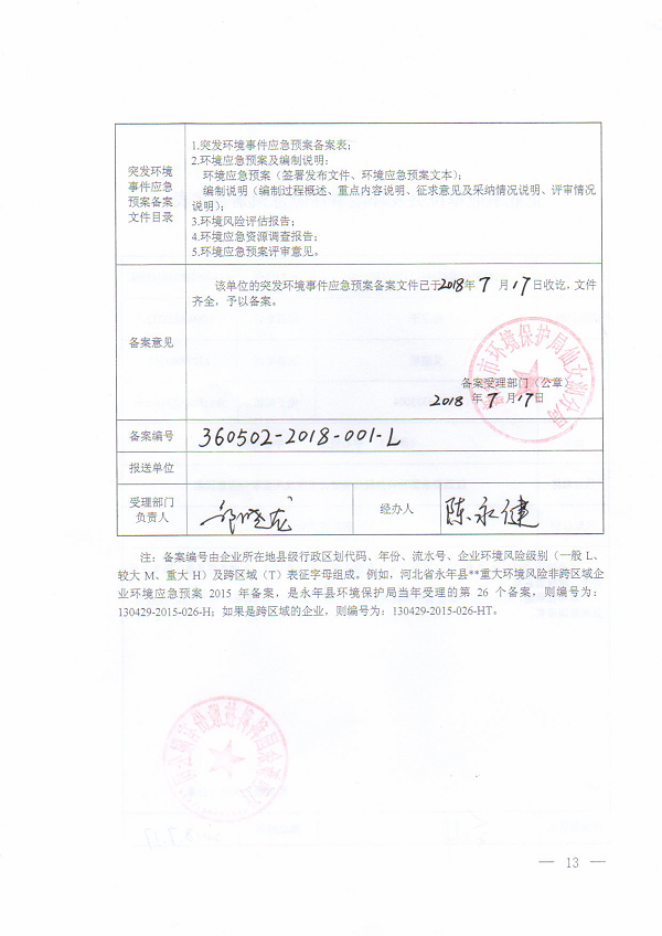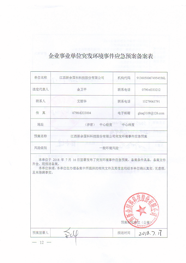 江西新余國科科技股份有限公司突發環境事件應急預案備案表