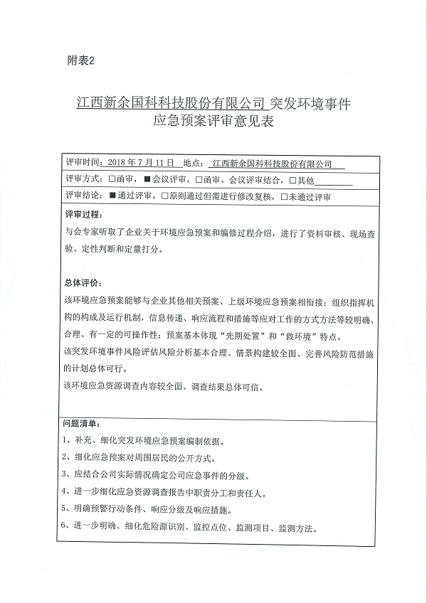 江西新余國科科技股份有限公司突發環境事件應急預案評審意見表