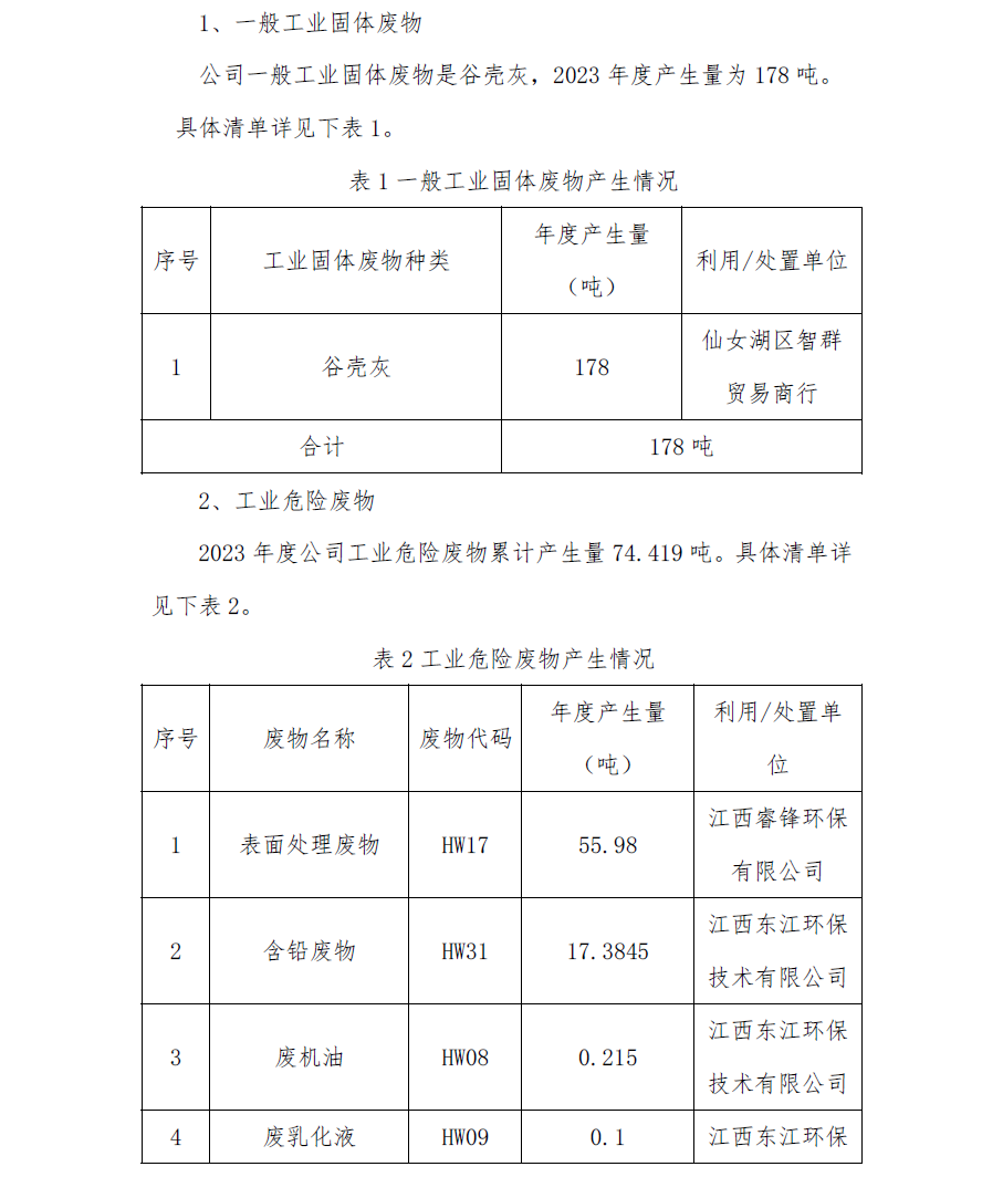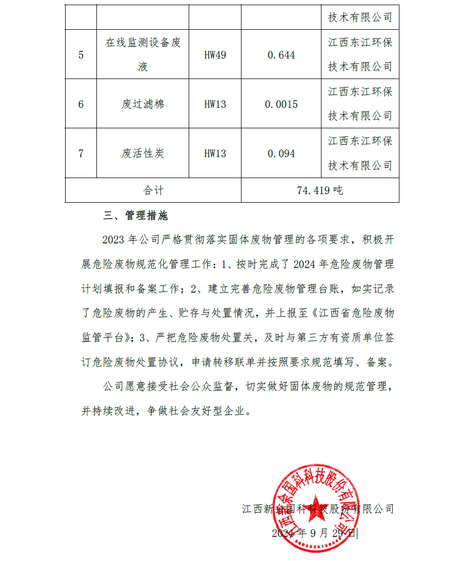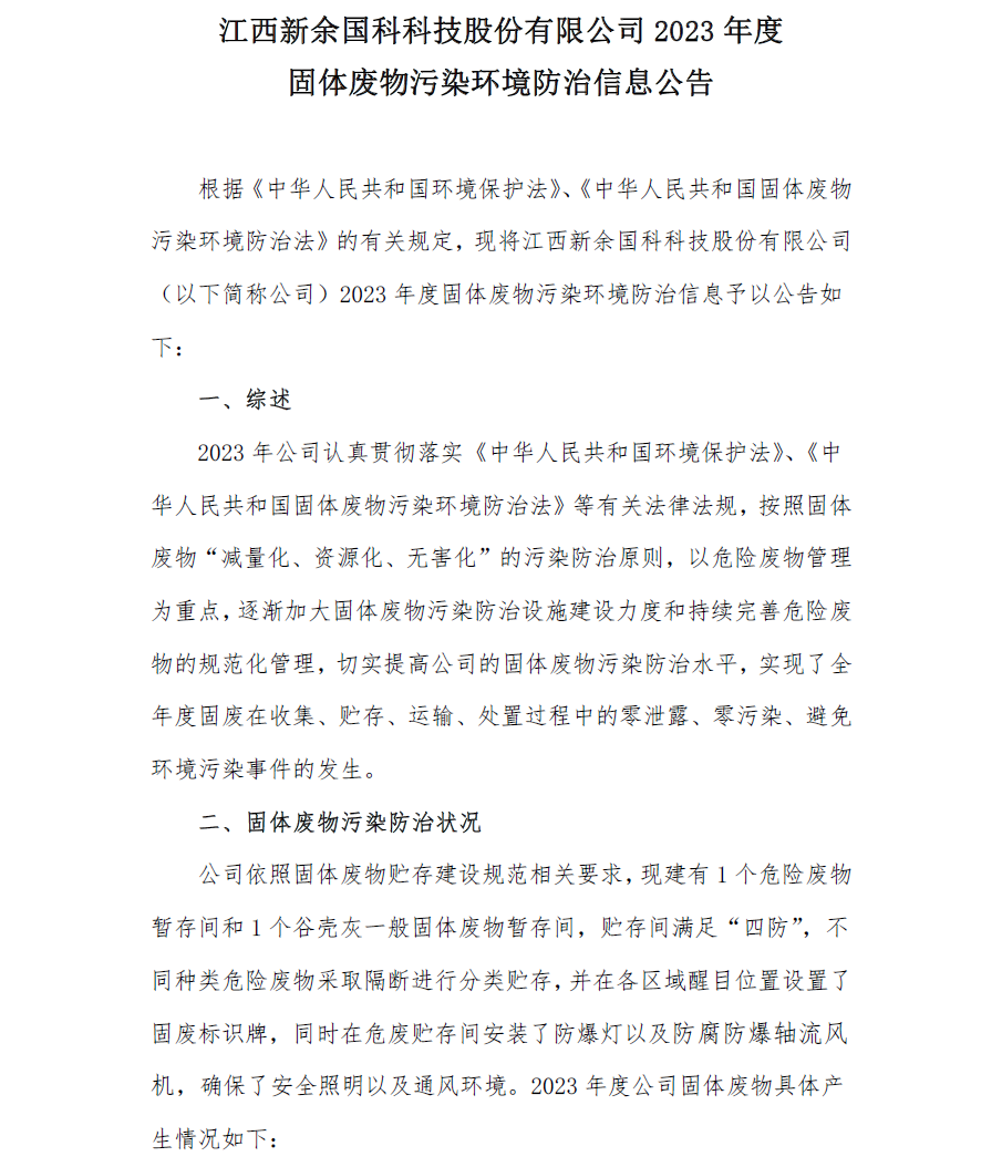 江西新余國科科技股份有限公司2023年度固體廢物污染環境防治信息公告